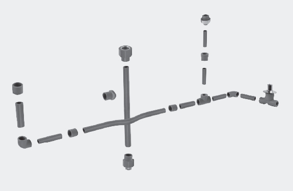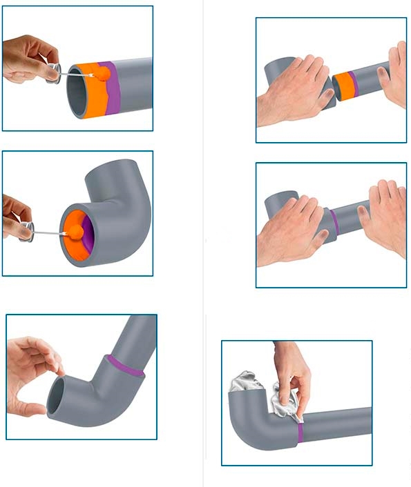 Esse processo pode ser utilizado na soldagem de CPVC SCH 80 e PVC “U”, sendo que o procedimento é realizado em tubo e conexão (Ponta X Bolsa) fazendo a limpeza das peças com PRIME e após, é passado uma cola especial para determinado material (PVC “U” ou CPVC SCH 80), conforme exemplo abaixo: