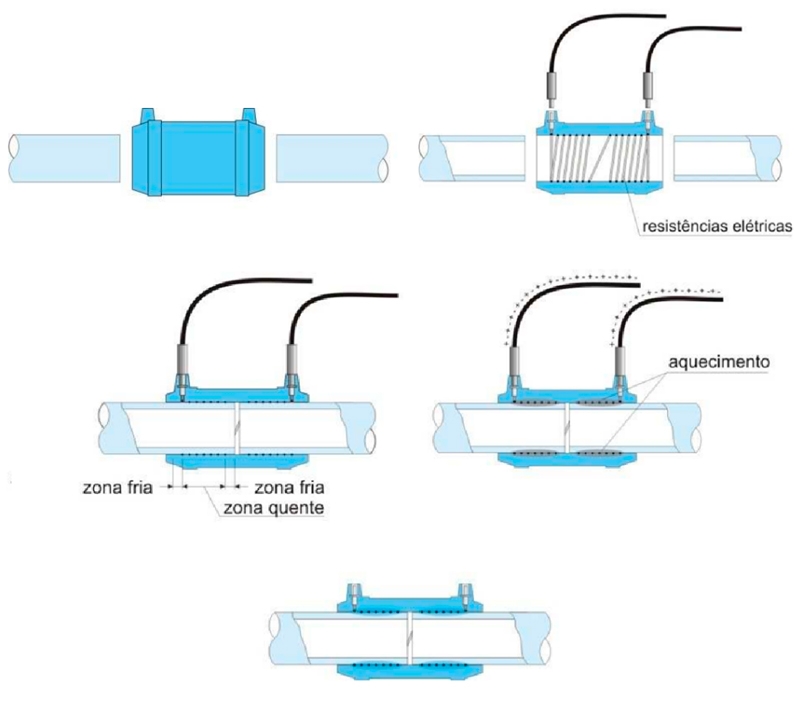 Esse processo pode ser utilizado na soldagem de Polipropileno (PPP) e Polietileno (PEAD), sendo que o procedimento parte da fusão do tubo com a conexão utilizando uma máquina específica para o procedimento, conforme exemplo abaixo: