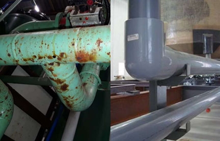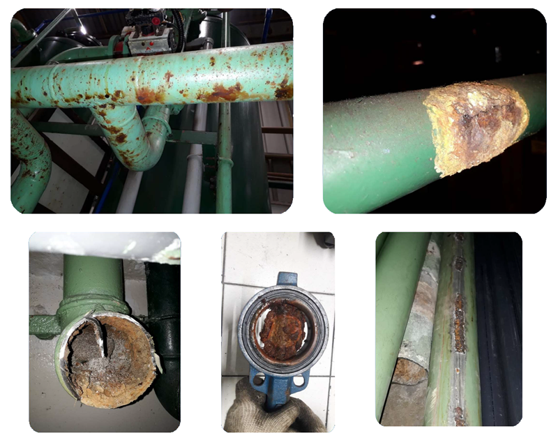 Há mais de 30 anos trabalhando com sistemas construídos em termoplástico de diferentes variedades em indústrias e usinas em todo Brasil, nos deparamos com diversos problemas com tubulações construídas em aço. No caso do transporte de água gelada, o principal motivo de parada para manutenção é referente a corrosão dos tubos e conexões de aço como mostra a figura abaixo. O Termoplástico pode ser utilizado apenas nos pontos críticos ou para substituição de toda tubulação.